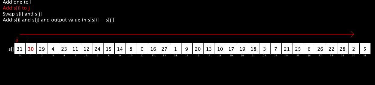 The following short video shows the RC4 algorithm in action. It's been restricted to 32 values rather than 256 to fit it nicely on the screen but the algorithm is identical. The red stream of numbers at the bottom shows the pseudo-random stream output by the algorithm. (The code for this animation is available here; thanks to @AntoineGrondin for making the animated GIF).